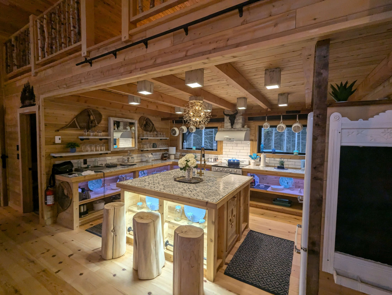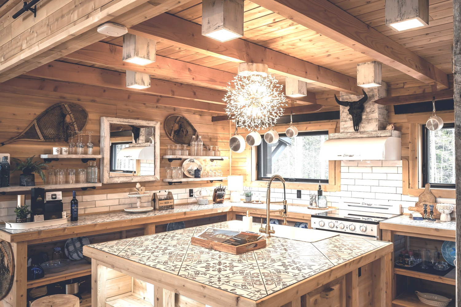 La terrasse en bois couverte, au plafond cathédrale, accessible en toutes saisons est un espace inspirant pour respirer l’air pur des montagnes, contempler la forêt et se reconnecter à l’essentiel pendant que vous concocter un souper pourquoi pas sur le BBQ.
